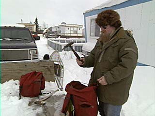 Chris O'Brien is an environmentalist who lives in town and works in an office during the week. He regularly walks to the office, even during winter when temperatures in this subarctic outpost drop below -40 degrees. Most weekends Chris treks several miles on snowshoes to a teepee that he has erected in the wilderness. | |